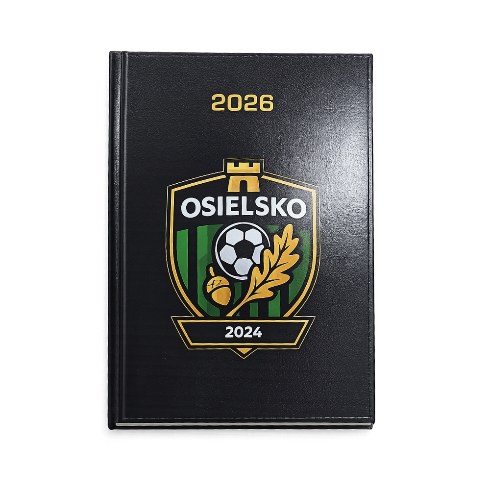 Twarda, czarna okładka o eleganckiej fakturze została ozdobiona złotym tłoczeniem „2026” ✨ oraz efektownym herbem Osielsko 🛡️, nadając całości prestiżowy charakter.